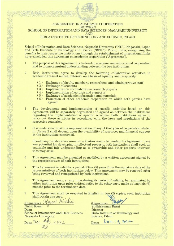 情報データ科学部は、西井 龍映学部長及びMUTHU SUBASH KAVITHA助教が訪印し、インド共和国 バーラ技術科学大学ピラニ校(Birla Institute of Technology and Science(BITS), Pilani)との間で部局間交流協定及び学生交流に関する覚書を締結しました。
