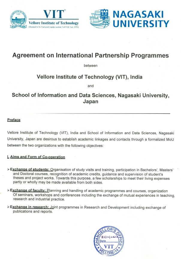 情報データ科学部は、西井 龍映学部長及びMUTHU SUBASH KAVITHA助教が訪印し、インド共和国 ベロア工科大学(Vellore Institute of Technology (VIT))との間で部局間交流協定及び学生交流に関する覚書を締結しました。